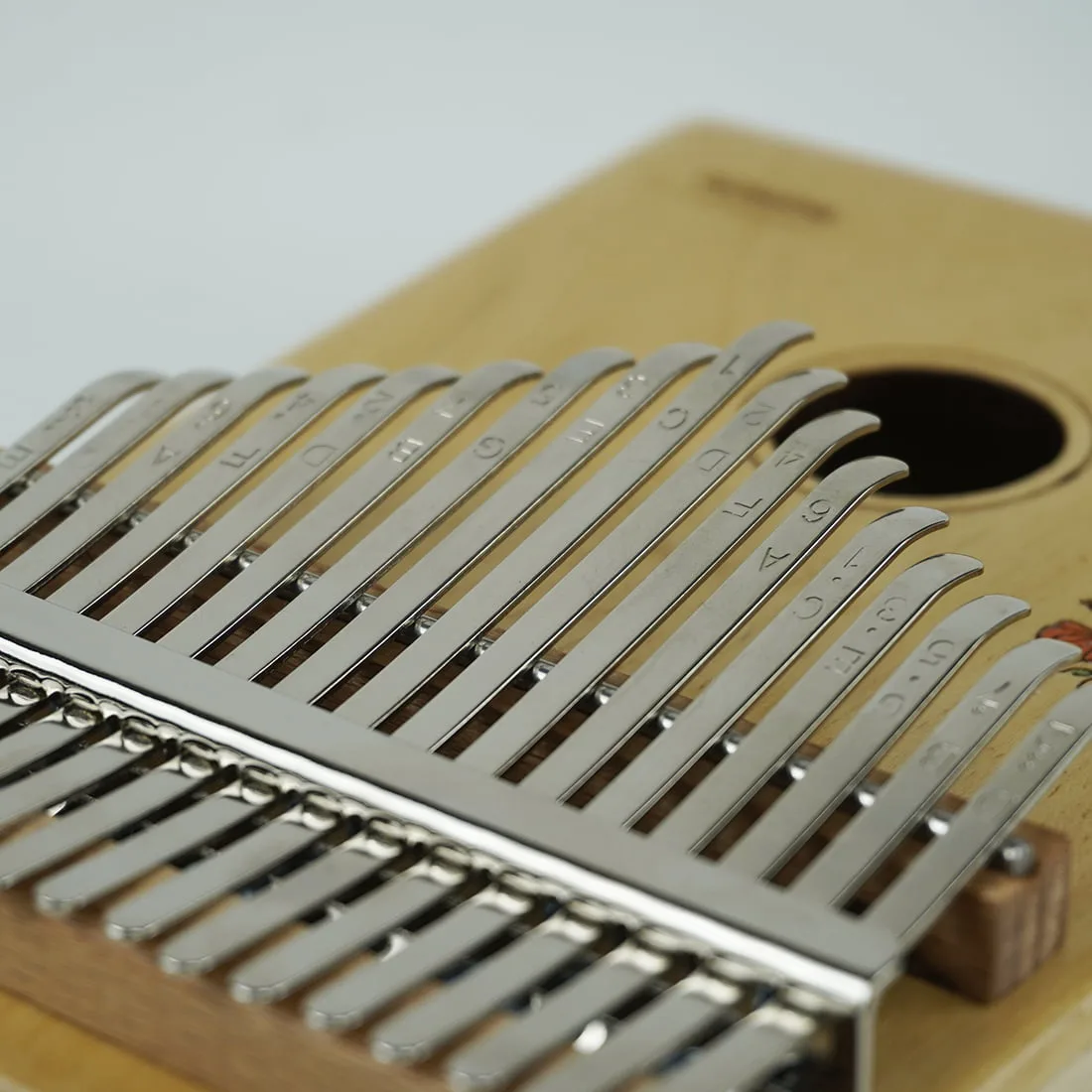 تیغه های این ساز فولاد فنر آبکاری شده با کروم میباشد . به دلیل صیقلی و شفاف بودن میتواد صدایی رسا و زیبا تولید کند.حروف و اعداد مربوط به نت هر تیغه روی آن حک شده است.